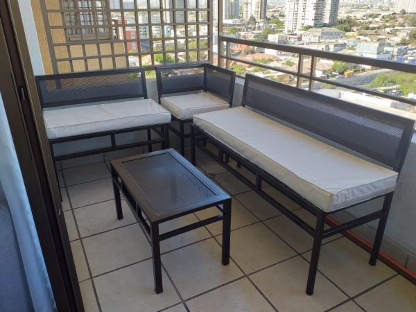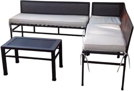 Banqueta modular 1,80×1,40 con mesa de centro 70×40 ideal para espacios más pequeños, adaptable a cualquier esquina, medidas pueden ser modificadas, tratamiento de pintado en polvo con anticorrosivo y pintura final en café marrón, plata viejo, blanco, negro, gris, todas con electro pintado, cojines de asiento de espuma de 7 cm de alta densidad el cual incluye funda lavables.