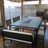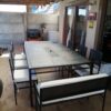 Hermoso comedor para 10 personas compuesto por una mesa de comedor de 1,85×1,20 y 6 sillas cuadradas malla más 2 banquetas dobles por cabecera con cojines y fundas lavables, además la mesa cuenta con 1 tacho de acero inoxidable desmontable que puede tener varios usos tales como hielera para el verano y en invierno como brasero desmontable. Cubierta de piedra pizarra multicolor y estructura de metal que puede ser en diversos tonos tales como negro, café marrón, plata viejo, óxido, blanco, todos con tratamiento de anticorrosivo en polvo y acabado final pintura a elección en electro pintado garantizando muchos años de vida útil.