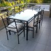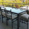 Hermoso comedor cubierta de vidrio de 1,80×95 que incluye 6 sillas modelo nudo más 2 sitiales con apoya brazos en cabeceras, el valor incluye cojines con sus respectivas fundas lavables, la estructura de metal tiene 2 capas, ya que somos los únicos en el mercado que le aplicamos primera capa de pintura al horno anticorrosiva y posterior a eso la pintará final que también es electro pintado.