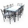 Hermoso comedor cubierta de vidrio de 1,80×95 que incluye 6 sillas modelo nudo más 2 sitiales con apoya brazos en cabeceras, el valor incluye cojines con sus respectivas fundas lavables, la estructura de metal tiene 2 capas, ya que somos los únicos en el mercado que le aplicamos primera capa de pintura al horno anticorrosiva y posterior a eso la pintará final que también es electro pintado.